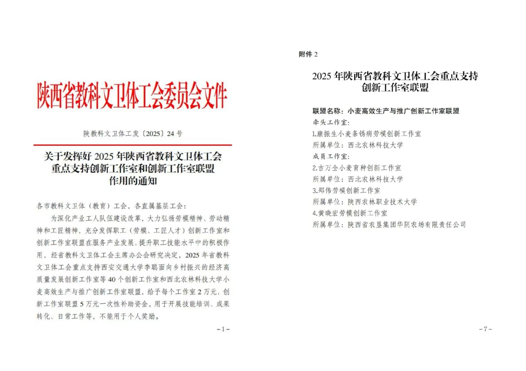 “郑伟创新工作室”此前已被列为省总工会“重点创新工作室”,此次入选,标志着其建设成果再获认可。作为西北农林科技大学康振生院士牵头组建的小麦高效生产与推广创新工作室联盟成员单位,“郑伟创新工作室”将充分发挥联盟平台优势,紧密对接前沿技术与职业本科教育实践,深入推进产学研协同创新,为服务乡村振兴战略和农业科技推广工作作出积极贡献。