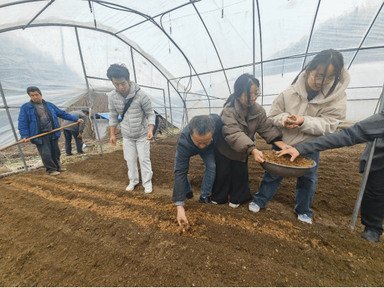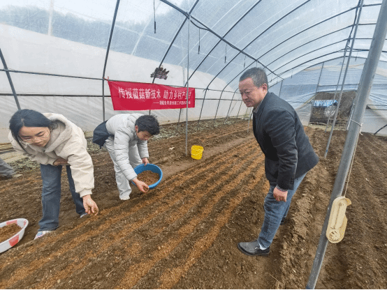 初冬时节,正是羊肚菌播种的关键时期。此次活动中,专家团队不仅为农户带来了急需的羊肚菌菌种、专用地膜等生产物资,更将课堂直接搬到了田间地头。在种植大棚内,胡煜主任、王锋、李务焜老师俯下身,围绕土壤处理、菌种播撒、覆膜保温、水分管理等关键技术环节,为农户进行了“手把手”的现场教学和示范操作。他们耐心解答农户在以往种植过程中遇到的疑难杂症,确保每一位参与种植的农户都能听得懂、学得会、用得上。随行的三名学生也在实践中深化了对专业知识的理解,展现了当代涉农院校学子的务实风貌。